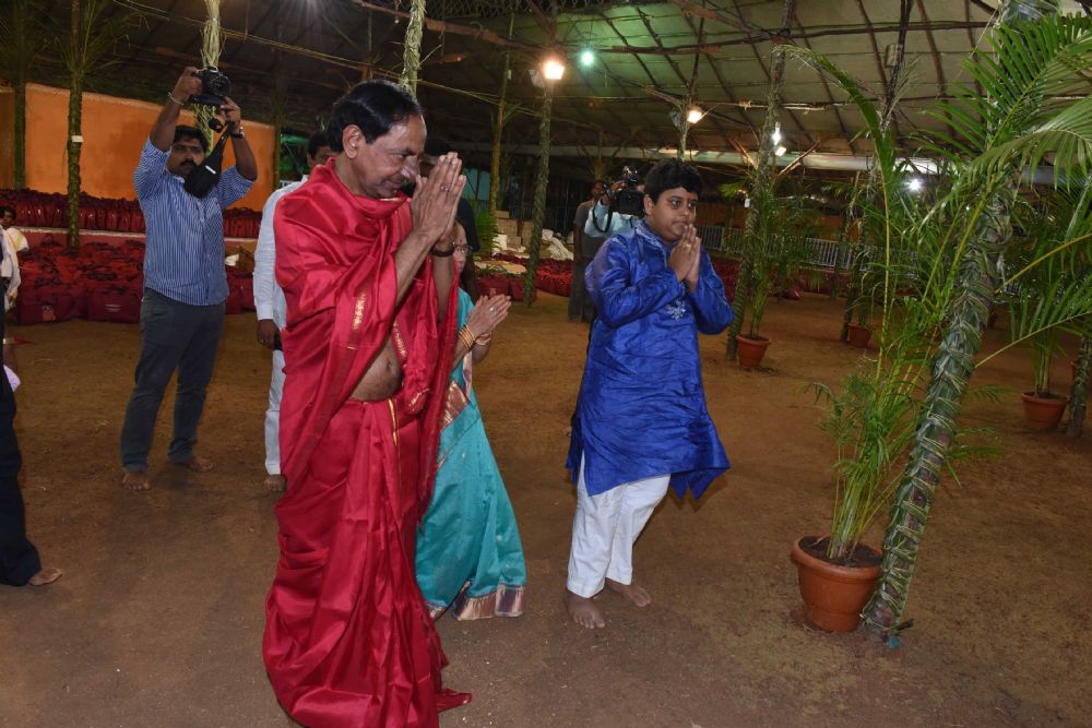 Telangana Chief Minister K. Chandrashekar Rao, along with family members, on Monday performed inaugural pooja in connection with 'Chandi Yagnam' being conducted at his farm house in Yerravelli of Medak district.