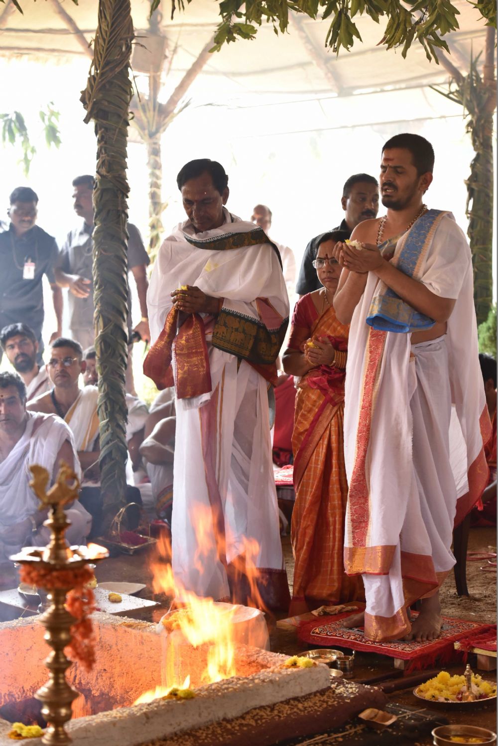 Telangana Chief Minister K. Chandrashekar Rao, along with family members, on Monday performed inaugural pooja in connection with 'Chandi Yagnam' being conducted at his farm house in Yerravelli of Medak district.
