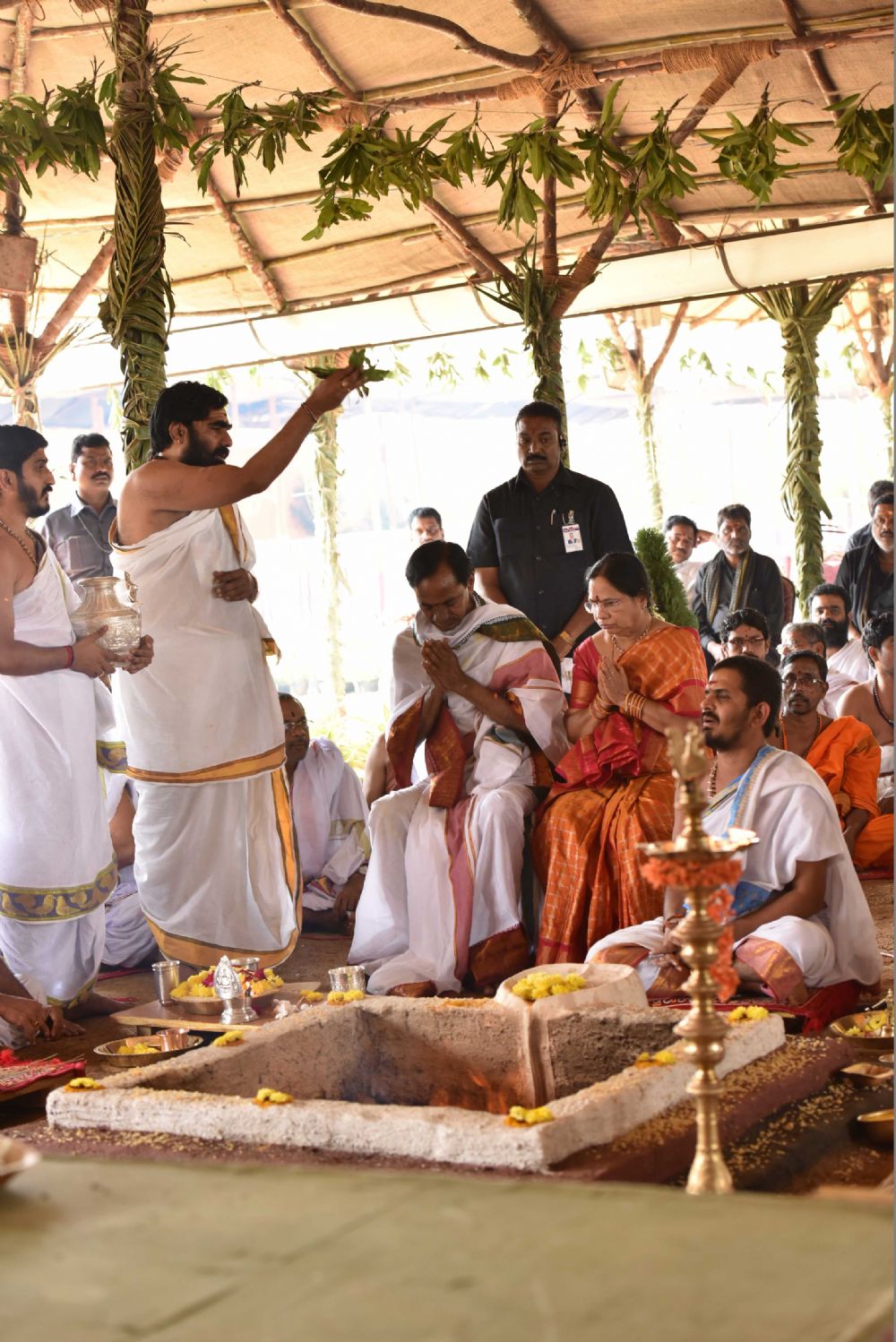 Telangana Chief Minister K. Chandrashekar Rao, along with family members, on Monday performed inaugural pooja in connection with 'Chandi Yagnam' being conducted at his farm house in Yerravelli of Medak district.