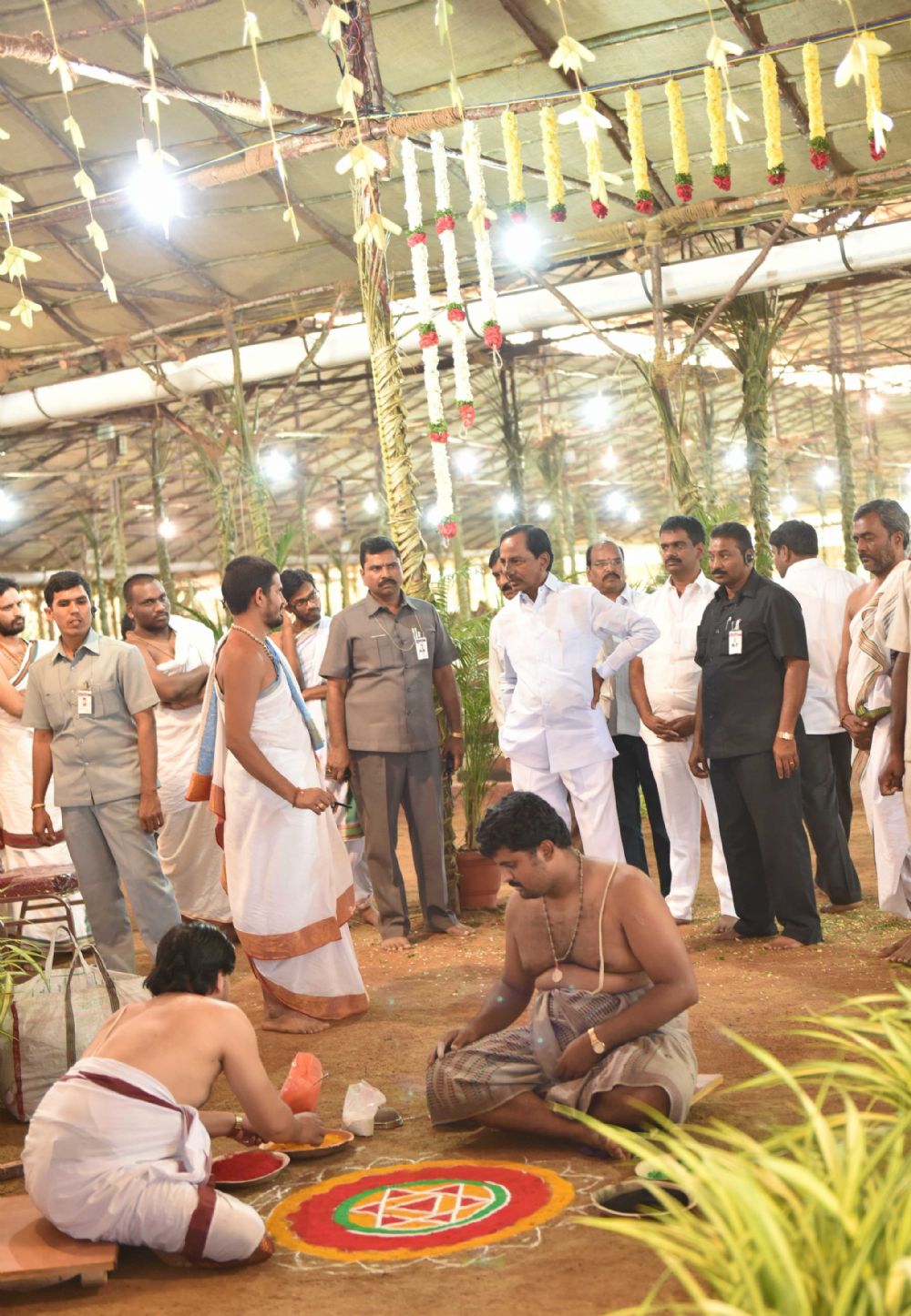 Telangana Chief Minister K. Chandrashekar Rao, along with family members, on Monday performed inaugural pooja in connection with 'Chandi Yagnam' being conducted at his farm house in Yerravelli of Medak district.