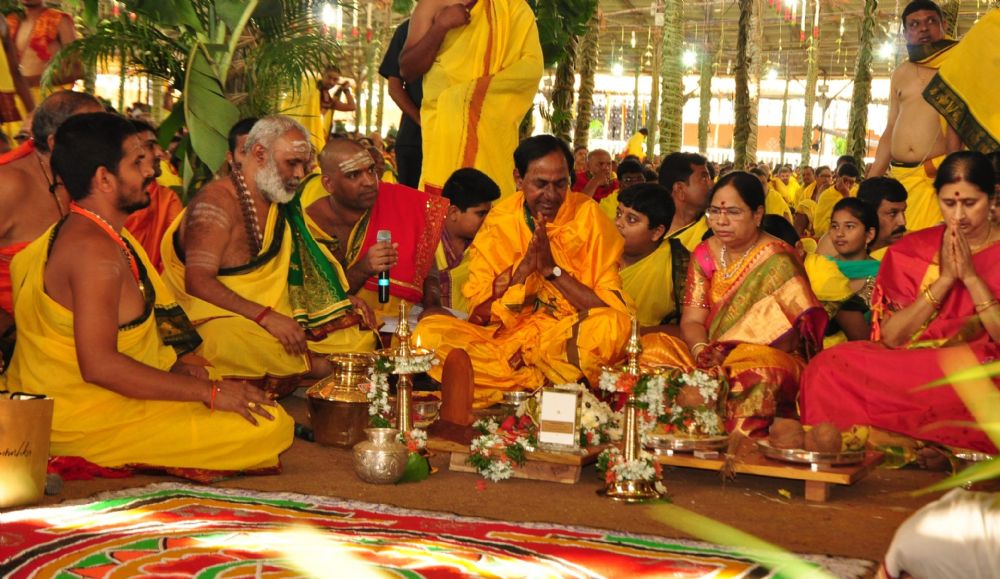 Telangana Chief Minister K. Chandrasekhar Rao and Governor ESL Narasimhan along with family members participated in Ayutha Chandi Maha Yagnam Day 1 pooja at farm house in Yerravelli of Medak district on 23rd December 2015.