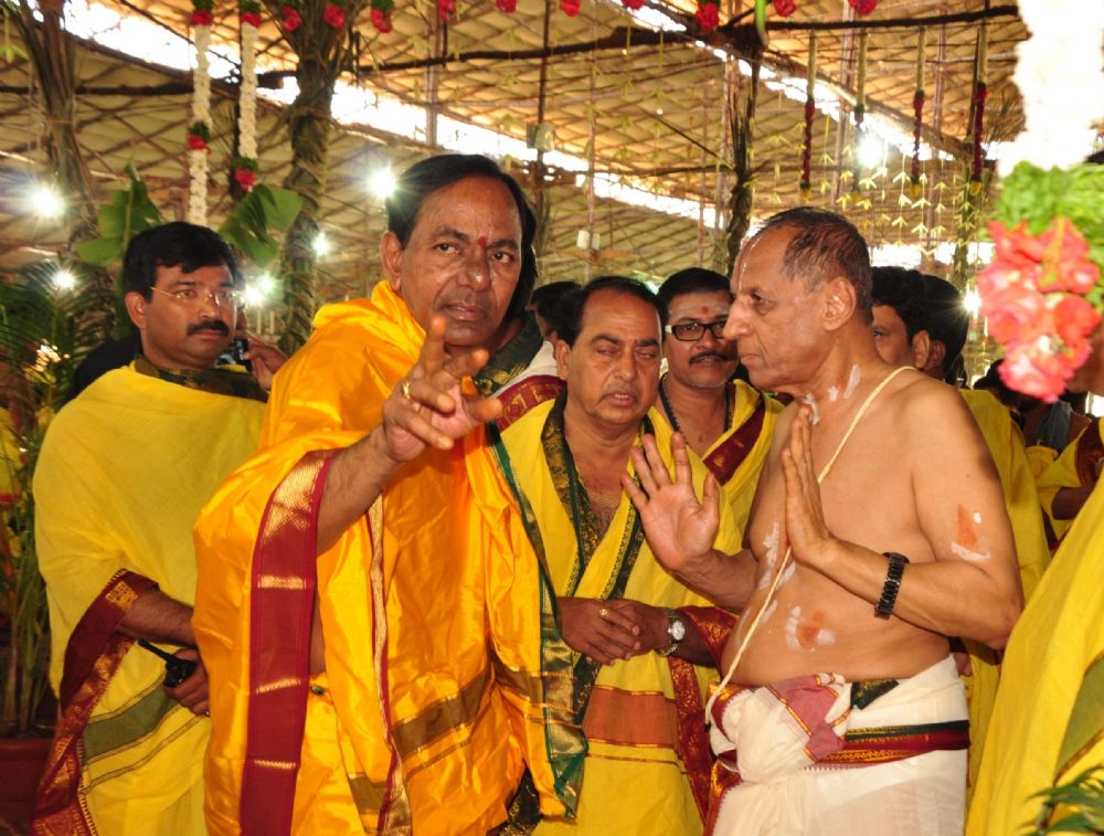 Telangana Chief Minister K. Chandrasekhar Rao and Governor ESL Narasimhan along with family members participated in Ayutha Chandi Maha Yagnam Day 1 pooja at farm house in Yerravelli of Medak district on 23rd December 2015.