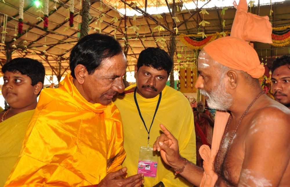 Telangana Chief Minister K. Chandrasekhar Rao and Governor ESL Narasimhan along with family members participated in Ayutha Chandi Maha Yagnam Day 1 pooja at farm house in Yerravelli of Medak district on 23rd December 2015.