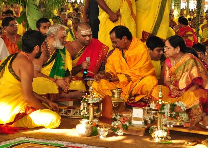 Telangana Chief Minister K. Chandrasekhar Rao and Governor ESL Narasimhan along with family members participated in Ayutha Chandi Maha Yagnam Day 1 pooja at farm house in Yerravelli of Medak district on 23rd December 2015.