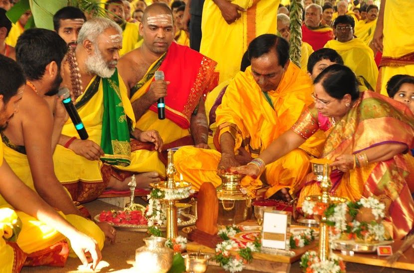 Telangana Chief Minister K. Chandrasekhar Rao and Governor ESL Narasimhan along with family members participated in Ayutha Chandi Maha Yagnam Day 1 pooja at farm house in Yerravelli of Medak district on 23rd December 2015.