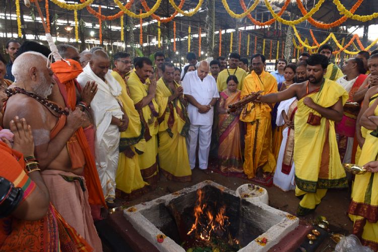 Chief Minister K. Chandrasekhar Rao with his family members, Ramoji Rao, Art of Living Founder Ravi Shankar and others participated in Ayuth Maha Chandi Yagnam Day 1 pooja at farm house in Yerravelli of Medak district on 23rd December 2015.