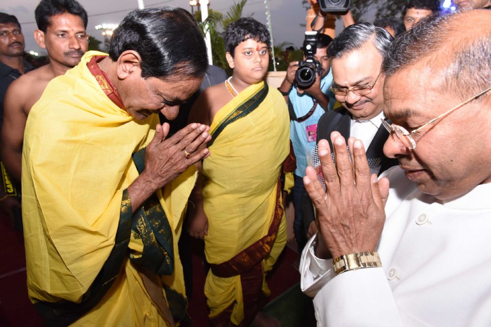 Chief Minister K. Chandrasekhar Rao and Union Ministers M. Venkaiah Naidu, Bandaru Datthathreya and others participated in Ayutha Chandi Yagam on Second Day at Yerravalli in Medak District.