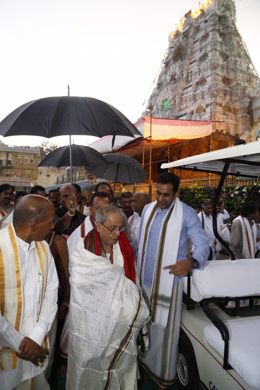 President of India Dr Pranab Mukherjee, Andhra Pradesh Governor ESL Narasimhan and Andhra Pradesh Chief Minister N. Chandrababu Naidu offered prayers at the Tirumala temple of Lord Venkateswara on Friday.