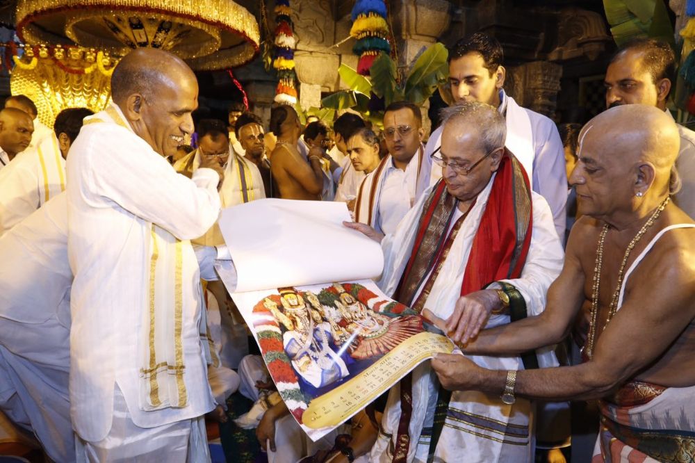 President of India Dr Pranab Mukherjee, Andhra Pradesh Governor ESL Narasimhan and Andhra Pradesh Chief Minister N. Chandrababu Naidu offered prayers at the Tirumala temple of Lord Venkateswara on Friday.