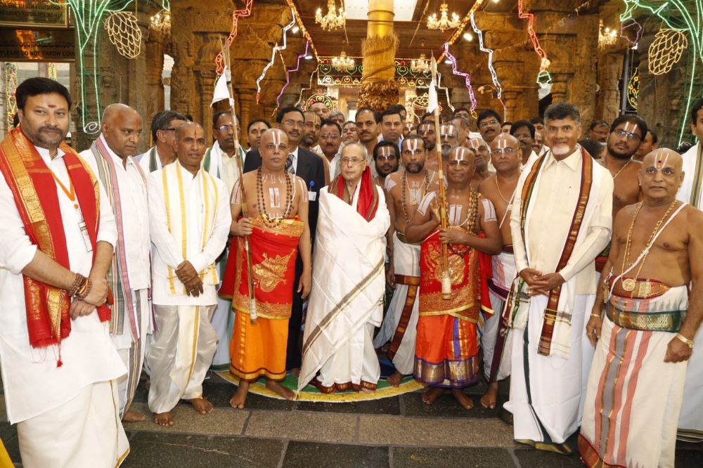 President of India Dr Pranab Mukherjee, Andhra Pradesh Governor ESL Narasimhan and Andhra Pradesh Chief Minister N. Chandrababu Naidu offered prayers at the Tirumala temple of Lord Venkateswara on Friday.
