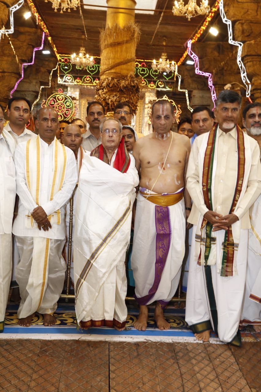 President of India Dr Pranab Mukherjee, Andhra Pradesh Governor ESL Narasimhan and Andhra Pradesh Chief Minister N. Chandrababu Naidu offered prayers at the Tirumala temple of Lord Venkateswara on Friday.