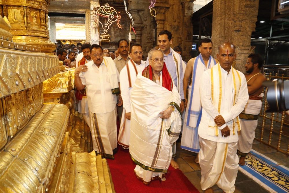 President of India Dr Pranab Mukherjee, Andhra Pradesh Governor ESL Narasimhan and Andhra Pradesh Chief Minister N. Chandrababu Naidu offered prayers at the Tirumala temple of Lord Venkateswara on Friday.
