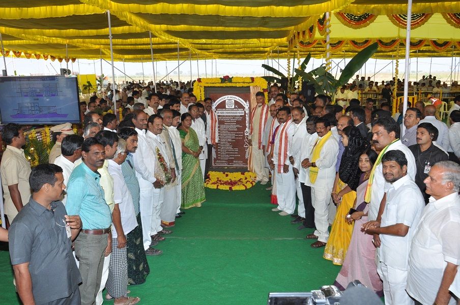 Andhra Pradesh Chief Minister N.Chandra Babu Naidu laying foundation stone for Temporary Secretariat Building at Velagapudi on 17th February 2016.