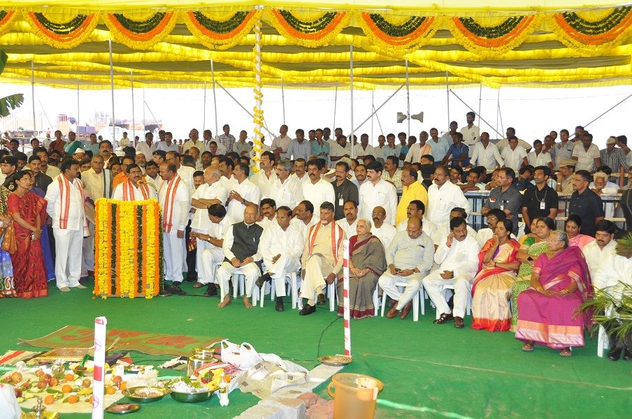 Andhra Pradesh Chief Minister N.Chandra Babu Naidu laying foundation stone for Temporary Secretariat Building at Velagapudi on 17th February 2016.