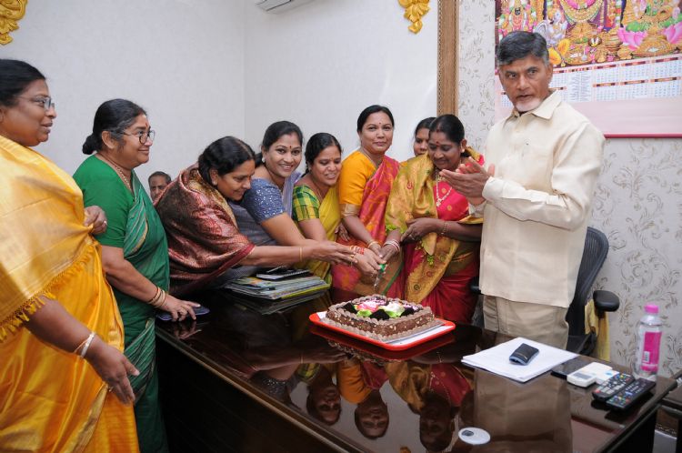 Chief Minister N. Chandrababu Naidu cake cutting on the occasion of International Women's Day at his chamber in Andhra Pradesh Assembly on 8th March 2016.