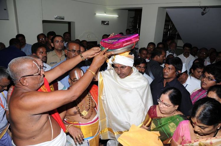 Telangana Chief Minister K. Chandrashekar Rao presented silk clothes and talambralu to the presiding deity of Lakshmi Narasimha on the eve of Kalyanotsavam as part of annual Brahmotsavams in Yadadri.