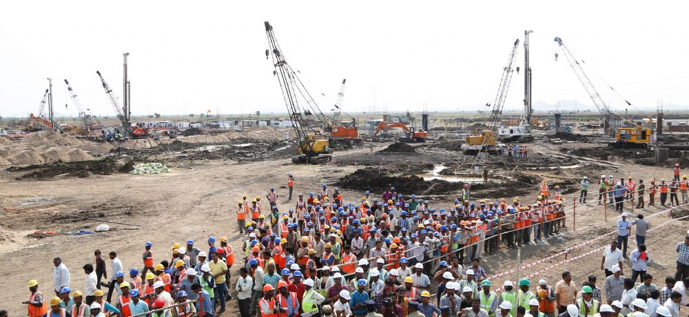 Andhra Pradesh Chief Minister N. Chandrababu Naidu inspects the ongoing temporary Secretariat work at Velagapudi village in Guntur District on 25th March 2016.
