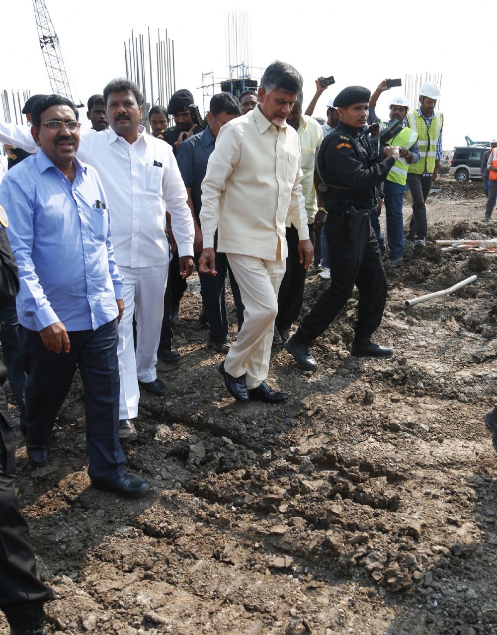 Andhra Pradesh Chief Minister N. Chandrababu Naidu inspects the ongoing temporary Secretariat work at Velagapudi village in Guntur District on 25th March 2016.