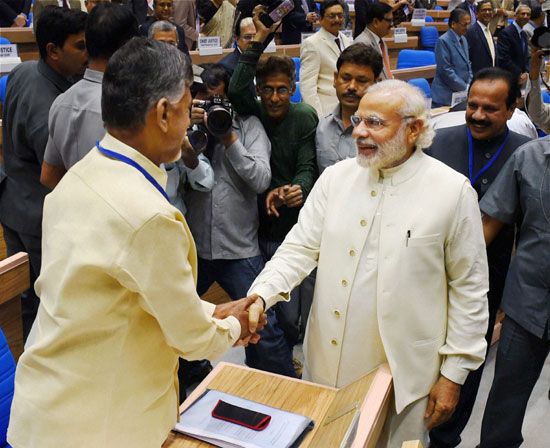 Prime Minister Narendra Modi and Andhra Pradesh Chief Minister Chandrababu Naidu at the conference of chief ministers and chief justices of high courts in Delhi on Sunday.