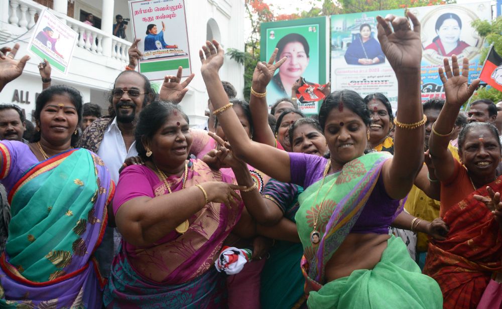 AIADMK supporters celebrate the party's victory in Tamil Nadu's assembly elections, at the party headquarters in Chennai on 19th May 2016.