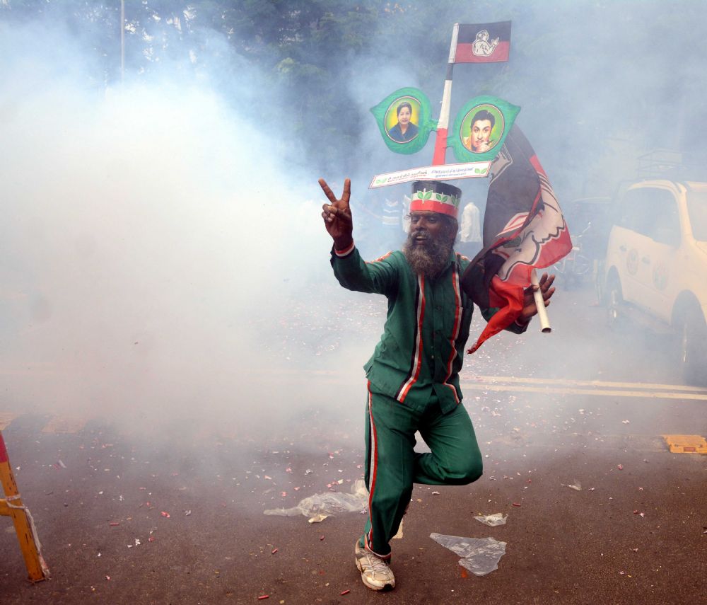 AIADMK supporters celebrate the party's victory in Tamil Nadu's assembly elections, at the party headquarters in Chennai on 19th May 2016.