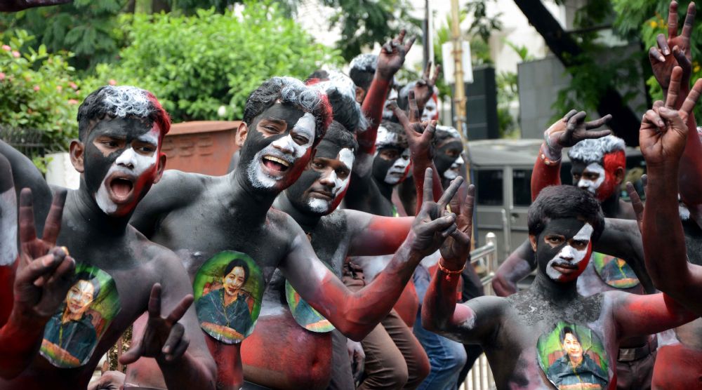 AIADMK supporters celebrate the party's victory in Tamil Nadu's assembly elections, at the party headquarters in Chennai on 19th May 2016.