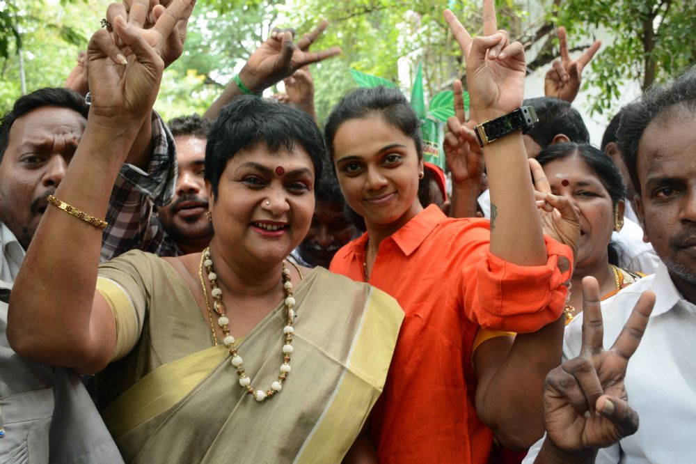 AIADMK supporters celebrate the party's victory in Tamil Nadu's assembly elections, at the party headquarters in Chennai on 19th May 2016.