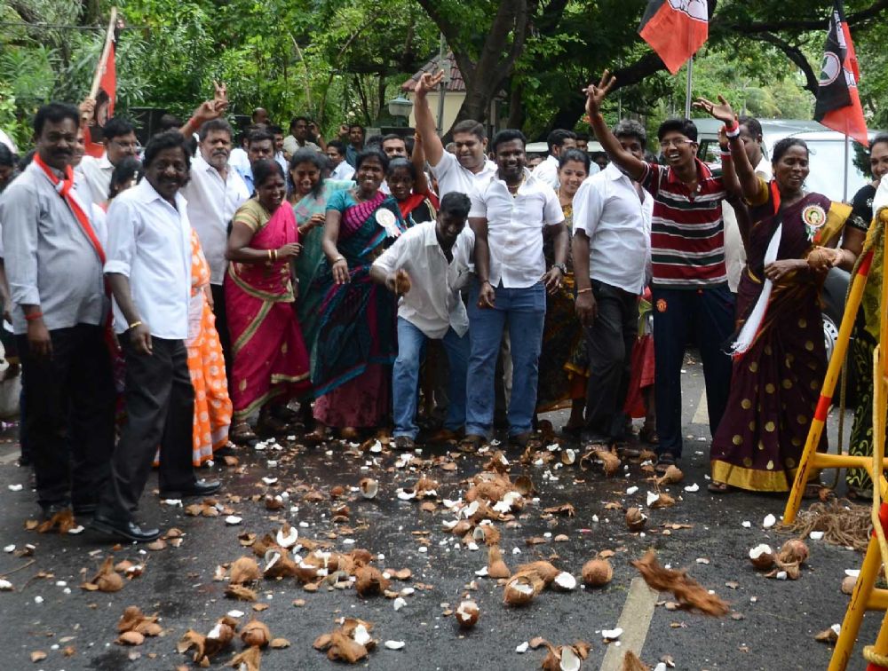 AIADMK supporters celebrate the party's victory in Tamil Nadu's assembly elections, at the party headquarters in Chennai on 19th May 2016.