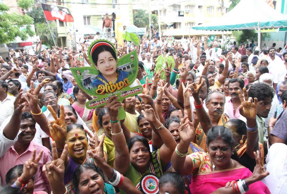 AIADMK supporters celebrate the party's victory in Tamil Nadu's assembly elections, at the party headquarters in Chennai on 19th May 2016.