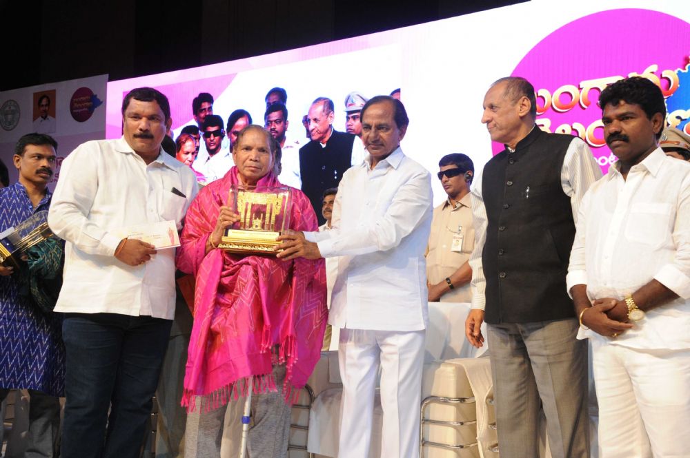 Governor ESL. Narasimhan and Chief Minister K. Chandrashekhar Rao Presenting Telangana State level Awards-2016 to the Awardees and Appointment Orders at the Special meeting of Telangana State Formation Day Celebrations at HICC, Madhapur on 2nd June 2016.