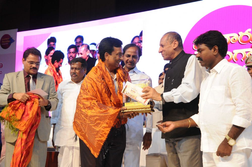Governor ESL. Narasimhan and Chief Minister K. Chandrashekhar Rao Presenting Telangana State level Awards-2016 to the Awardees and Appointment Orders at the Special meeting of Telangana State Formation Day Celebrations at HICC, Madhapur on 2nd June 2016.