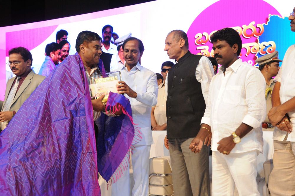 Governor ESL. Narasimhan and Chief Minister K. Chandrashekhar Rao Presenting Telangana State level Awards-2016 to the Awardees and Appointment Orders at the Special meeting of Telangana State Formation Day Celebrations at HICC, Madhapur on 2nd June 2016.