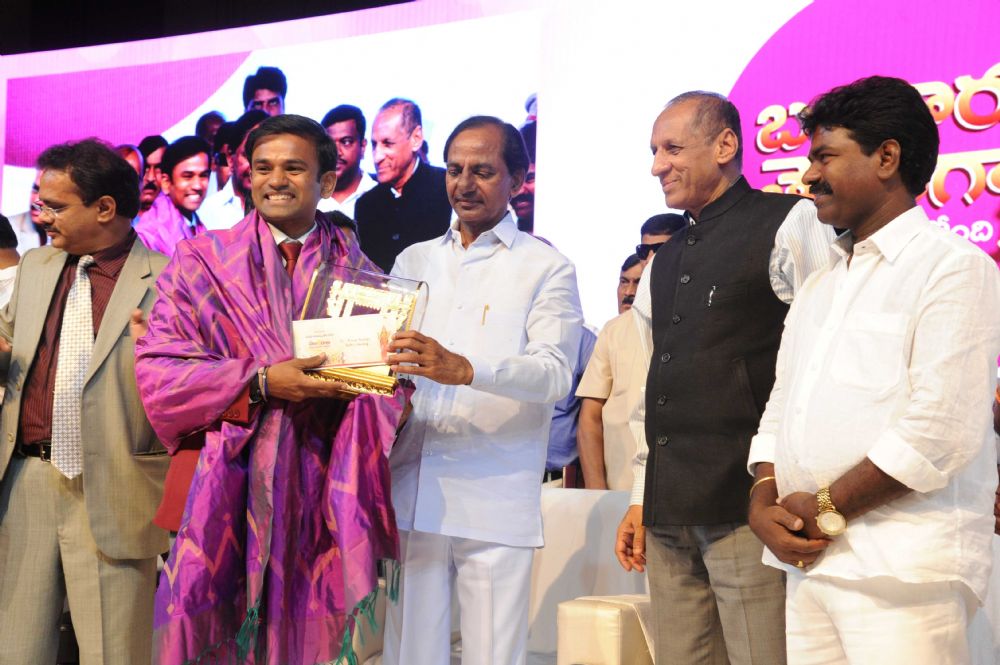 Governor ESL. Narasimhan and Chief Minister K. Chandrashekhar Rao Presenting Telangana State level Awards-2016 to the Awardees and Appointment Orders at the Special meeting of Telangana State Formation Day Celebrations at HICC, Madhapur on 2nd June 2016.