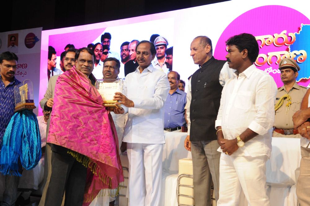 Governor ESL. Narasimhan and Chief Minister K. Chandrashekhar Rao Presenting Telangana State level Awards-2016 to the Awardees and Appointment Orders at the Special meeting of Telangana State Formation Day Celebrations at HICC, Madhapur on 2nd June 2016.