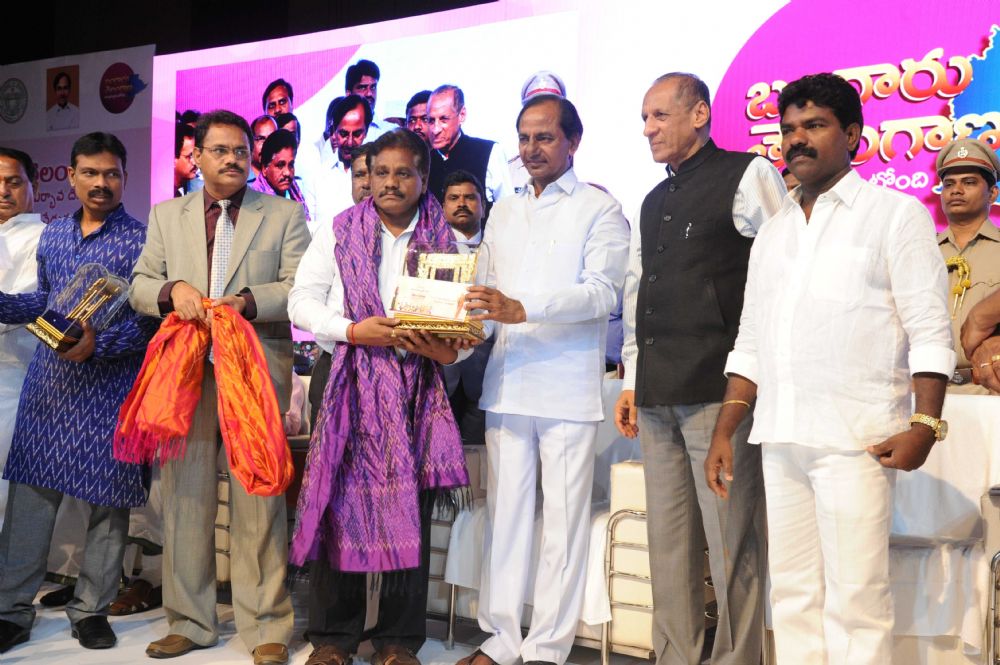 Governor ESL. Narasimhan and Chief Minister K. Chandrashekhar Rao Presenting Telangana State level Awards-2016 to the Awardees and Appointment Orders at the Special meeting of Telangana State Formation Day Celebrations at HICC, Madhapur on 2nd June 2016.