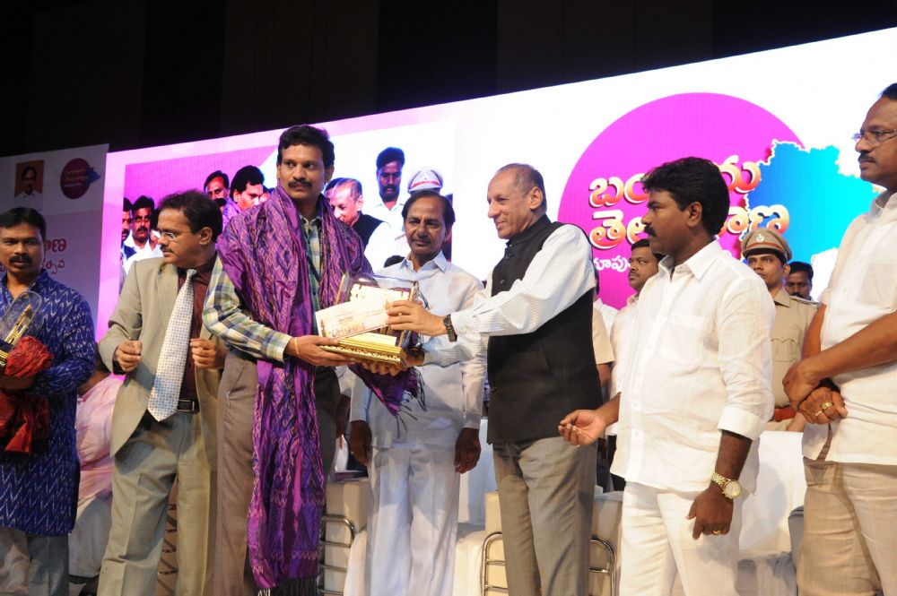Governor ESL. Narasimhan and Chief Minister K. Chandrashekhar Rao Presenting Telangana State level Awards-2016 to the Awardees and Appointment Orders at the Special meeting of Telangana State Formation Day Celebrations at HICC, Madhapur on 2nd June 2016.