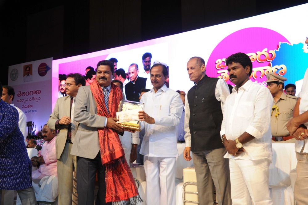 Governor ESL. Narasimhan and Chief Minister K. Chandrashekhar Rao Presenting Telangana State level Awards-2016 to the Awardees and Appointment Orders at the Special meeting of Telangana State Formation Day Celebrations at HICC, Madhapur on 2nd June 2016.