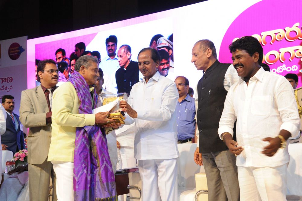 Governor ESL. Narasimhan and Chief Minister K. Chandrashekhar Rao Presenting Telangana State level Awards-2016 to the Awardees and Appointment Orders at the Special meeting of Telangana State Formation Day Celebrations at HICC, Madhapur on 2nd June 2016.