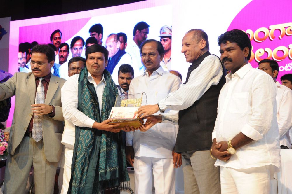 Governor ESL. Narasimhan and Chief Minister K. Chandrashekhar Rao Presenting Telangana State level Awards-2016 to the Awardees and Appointment Orders at the Special meeting of Telangana State Formation Day Celebrations at HICC, Madhapur on 2nd June 2016.