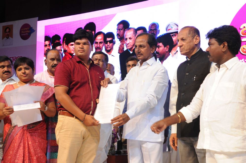 Governor ESL. Narasimhan and Chief Minister K. Chandrashekhar Rao Presenting Telangana State level Awards-2016 to the Awardees and Appointment Orders at the Special meeting of Telangana State Formation Day Celebrations at HICC, Madhapur on 2nd June 2016.