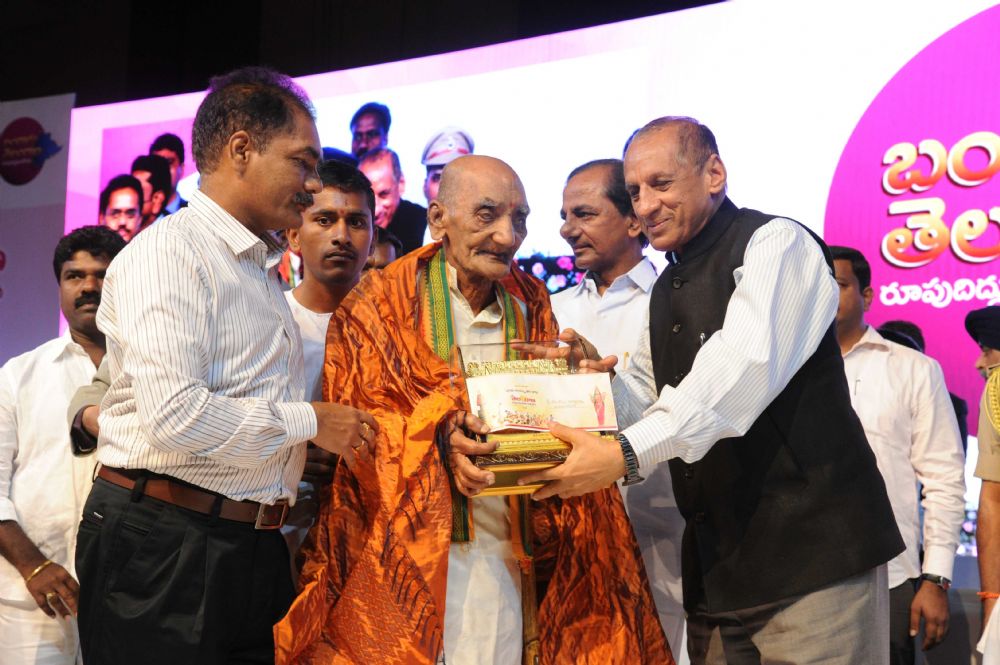 Governor ESL. Narasimhan and Chief Minister K. Chandrashekhar Rao Presenting Telangana State level Awards-2016 to the Awardees and Appointment Orders at the Special meeting of Telangana State Formation Day Celebrations at HICC, Madhapur on 2nd June 2016.