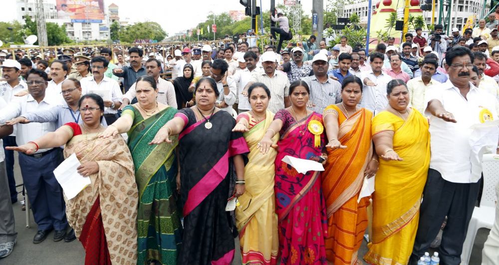 Andhra Pradesh Chief Minister N. Chandrababu Naidu, Speaker Kodela Siva Prasad, TDP Leaders along with Public took an oath at the Nava Nirmana Deeksha in Vijayawada, Striving for the Development of AP State on 2nd June 2016.