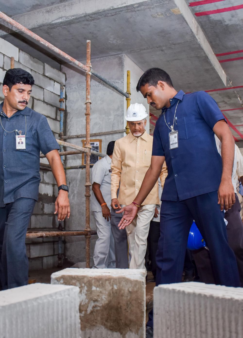 Andhra Pradesh Chief Minister N. Chandrababu Naidu inspecting the on going Secretariat building works in Velagapudi on 6th June 2016.
