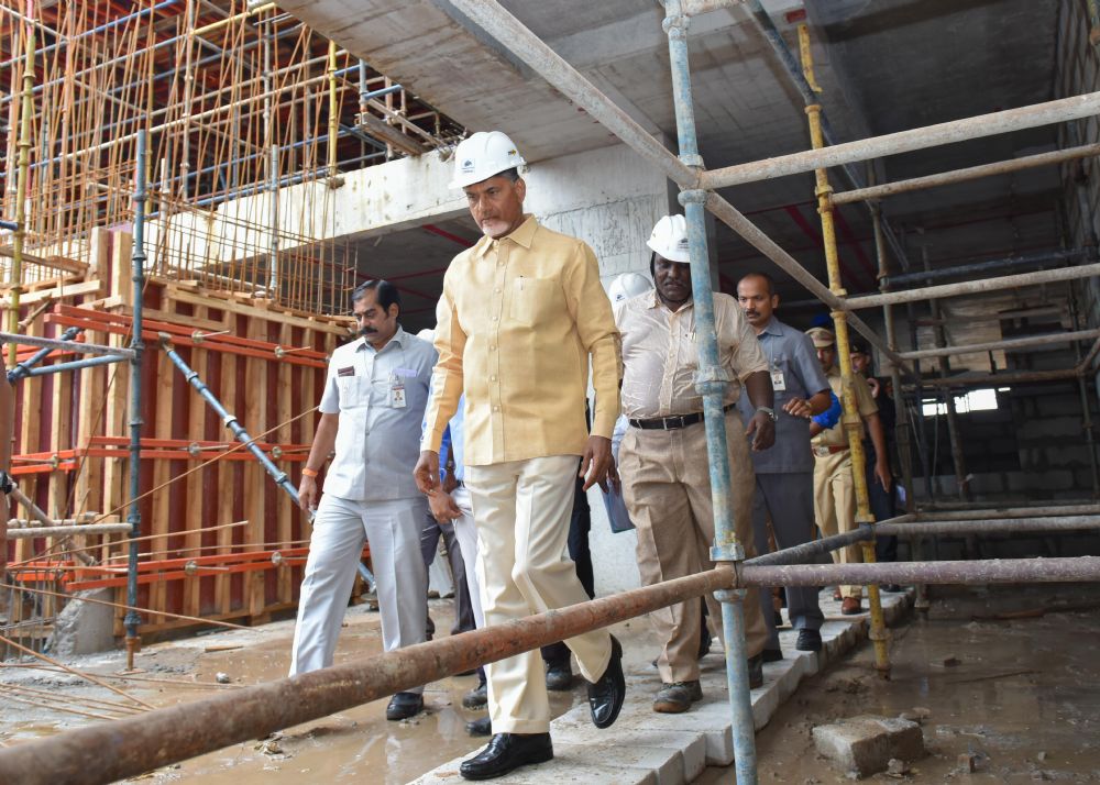 Andhra Pradesh Chief Minister N. Chandrababu Naidu inspecting the on going Secretariat building works in Velagapudi on 6th June 2016.