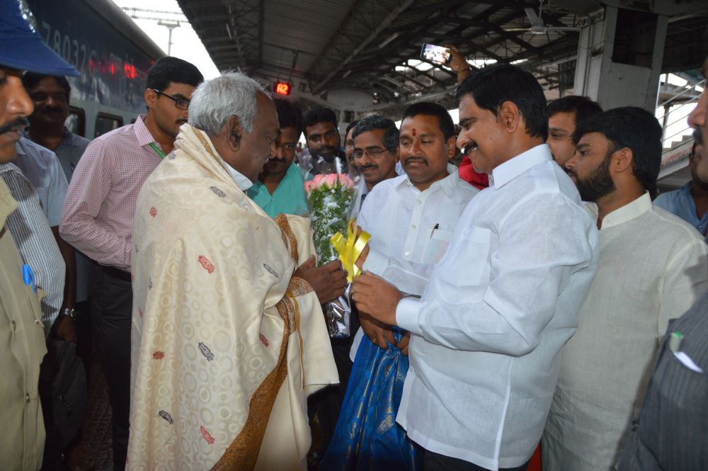 Andhra Pradesh Irrigation Minister Devineni Uma Maheswara Rao receiving RADHAKRISHNAN, Union Minister of State for Road, Transport, Highways & Shipping in Vijayawada Railway Station on7th June 2016.