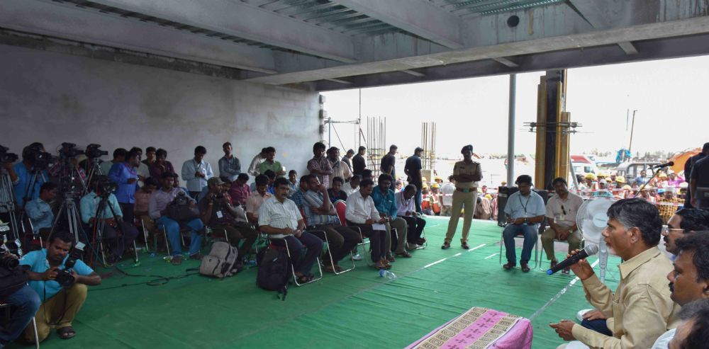 Andhra Pradesh Chief Minister N. Chandrababu Naidu inspecting the on going Secretariat building works in Velagapudi on 15th June 2016.