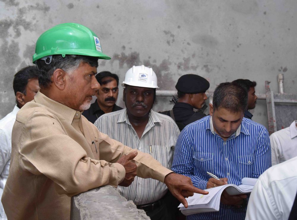 Andhra Pradesh Chief Minister N. Chandrababu Naidu inspecting the on going Secretariat building works in Velagapudi on 15th June 2016.
