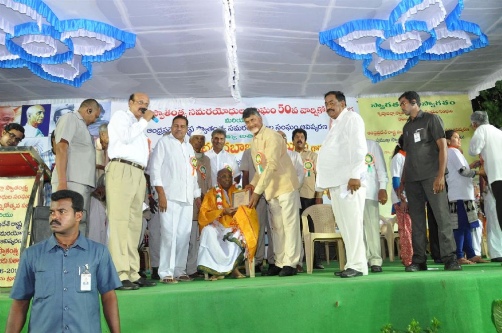Andhra Pradesh Chief Minister N. Chandrababu Naidu felicitating Freedom Fighters from Krishna District at Vijayawada on 18th June 2016.