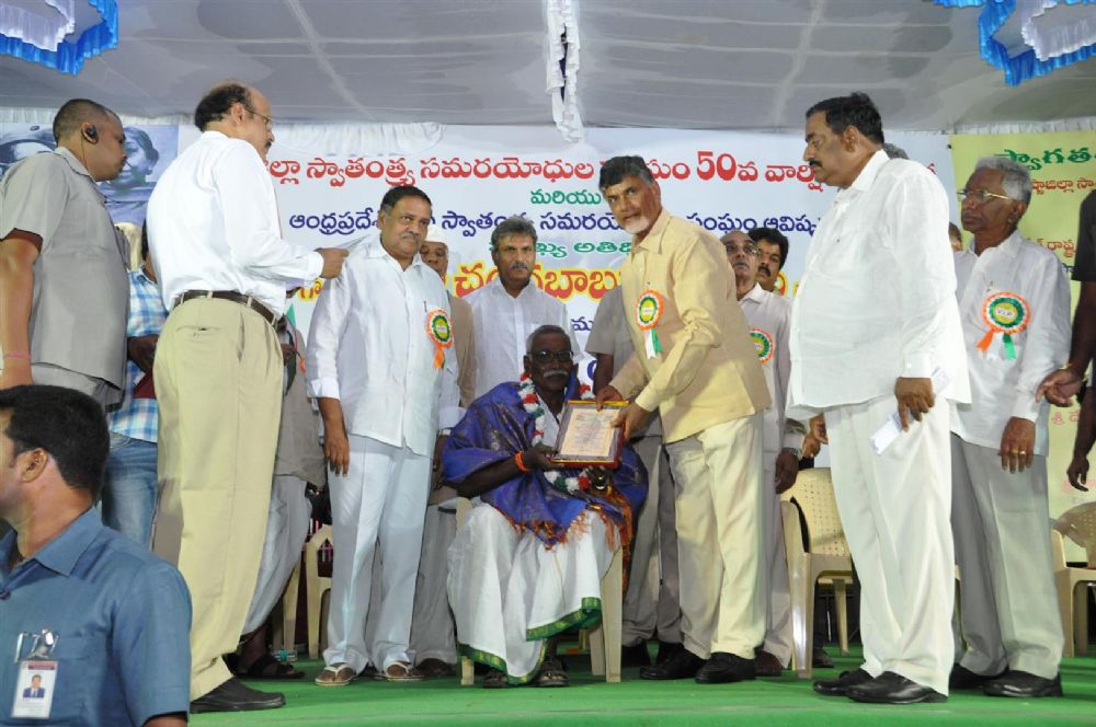 Andhra Pradesh Chief Minister N. Chandrababu Naidu felicitating Freedom Fighters from Krishna District at Vijayawada on 18th June 2016.