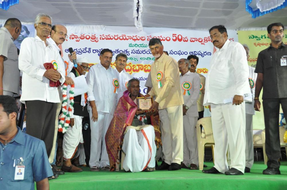 Andhra Pradesh Chief Minister N. Chandrababu Naidu felicitating Freedom Fighters from Krishna District at Vijayawada on 18th June 2016.